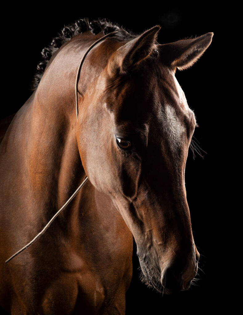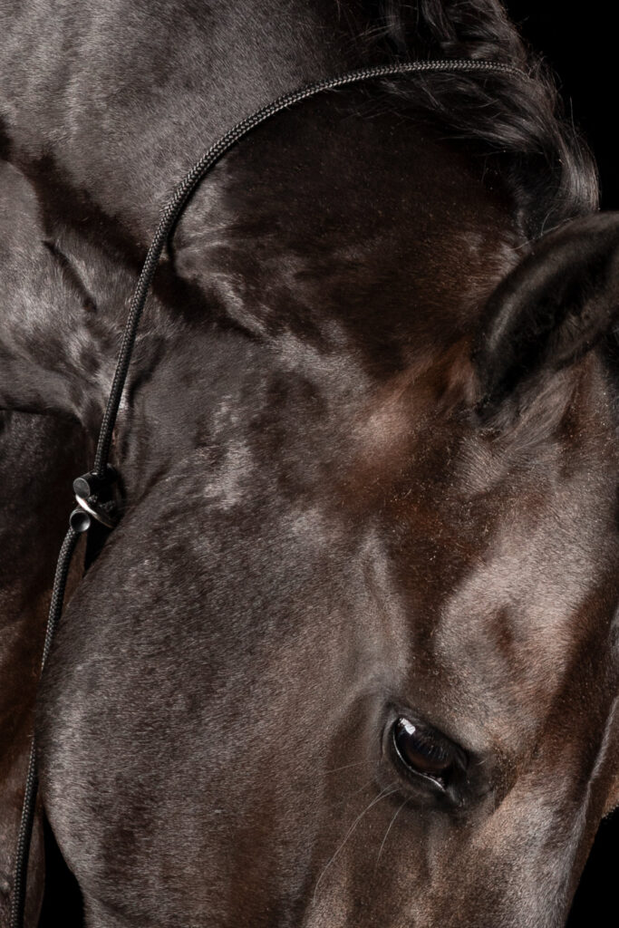 Paarden worden steeds vaker in de studio gefotografeerd. Deze foto’s hebben over het algemeen meer detail en scherpte, ieder haartje is zichtbaar. Om een halster weg te werken in Photoshop is dan ook moeilijker dan bij een ander soort shoot. Aangezien het paard vaak in een stalgang of binnenbak staat en in principe niet van het erf kan heb ik het studiohalster ontworpen. Deze zit alleen om de hals van het paard en scheelt enorm veel tijd in het wegwerken. Het halster heeft een dubbele stop waardoor het touw niet strak getrokken kan worden om de hals van het paard.